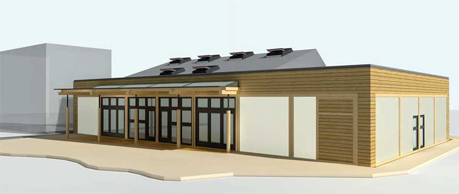 Designed by Hewitt Studios with Integral Engineering Design for the College's campus at Holme Lacy, the 100- seat cafe uses ModCell straw bale panels and features a 'green' sedum wall and terrace seating area. Local students helped to construct the pre-fabricated timber frame.