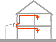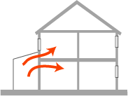 Natural ventilation Warm air can flow into adjoining spaces via openable vents located in the common wall at the top of the sunspace. Cool air is returned from the living spaces through lower vents to be heated as part of the convective loop. (‘Thermosiphoning’) |