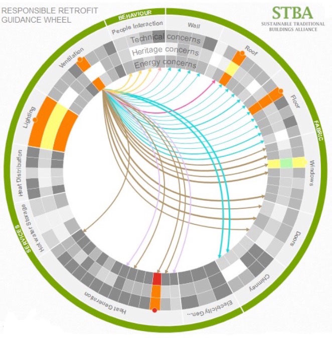 One useful tool, which helps understand these relationships better, is the responsible retrofit guidance wheel developed by the Sustainable Traditional Buildings Alliance (STBA). This depicts a range of measures and encourages exploration of the advantages, concerns and interactions that result.