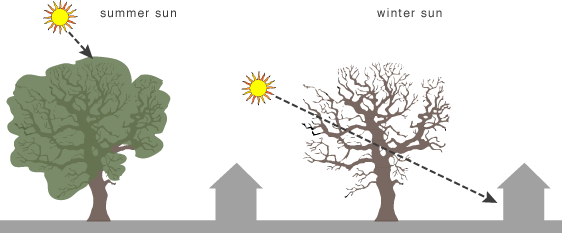 Deciduous trees should be planted to optimise shading in the summer whilst permitting sun to penetrate at low winter angles. Ensure that the planting is not too dense that it limits daylight.