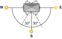 The main orientation of the building should be within 30° of south. Houses oriented east of south will benefit from the morning sun. Those orientated west of south will catch the late afternoon sun – which can help delay the evening heating period. |